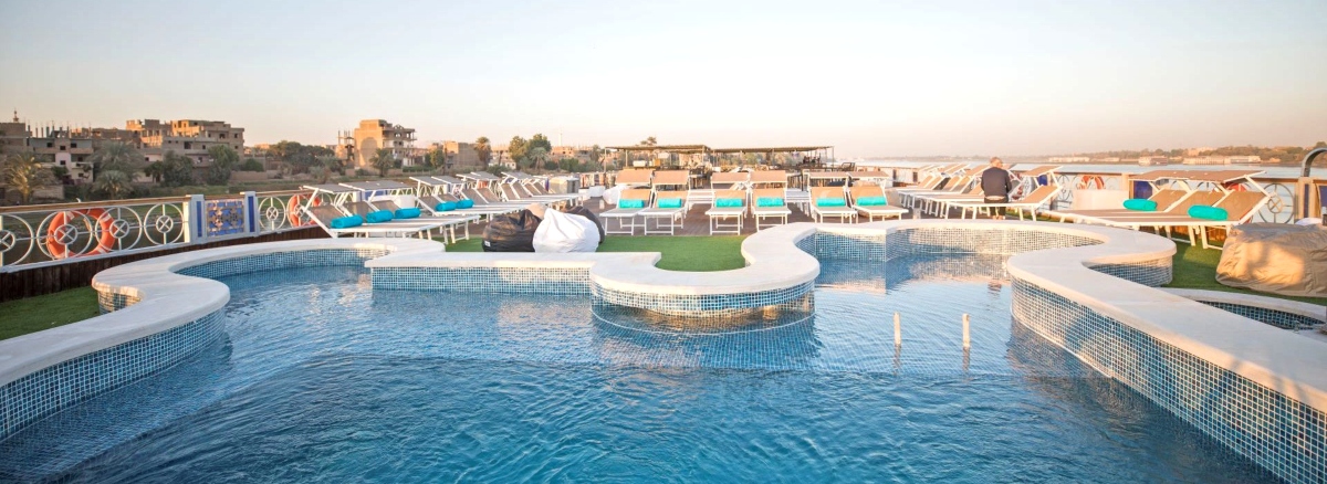 Life aboard the Semiramis III combines the charm of traditional Nile cruising with modern comforts. Relax on the spacious sun deck with panoramic views, take a refreshing dip in the pool, or unwind in the lounge bar. The ship also features a main restaurant serving international and Egyptian cuisine, ensuring a delightful dining experience. Evening entertainment includes cultural performances such as Nubian dances and a lively Galabeya party